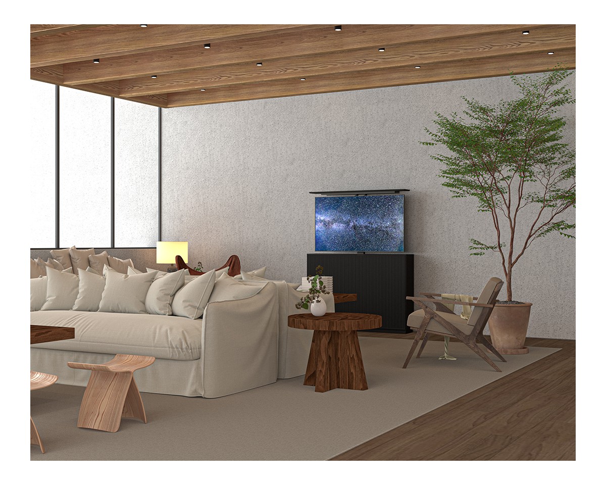 The cabinet’s identical front and back allow it to be placed anywhere in a room without compromising aesthetics. With a sleek, user-friendly design, it looks great from every angle. A designated space beneath the display accommodates standard soundbars or videobars, ensuring excellent audio and video quality. All cords and wires are neatly concealed for safety and aesthetics.