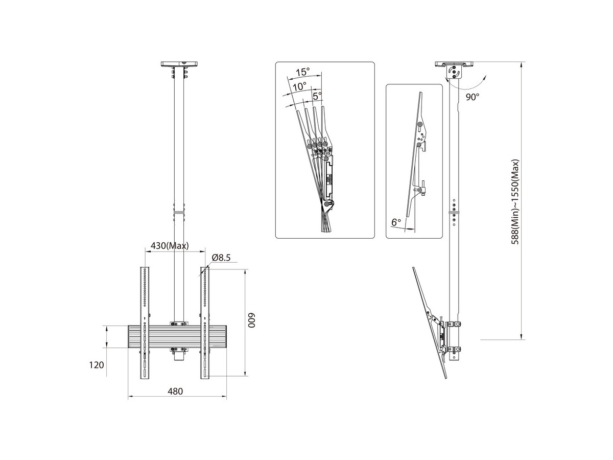 | Pillar length: | Min: 580mm to Max: 1550 mm from ceiling to VESA plate center Extension pipes: 1.5m (800mm*2pcs) included |