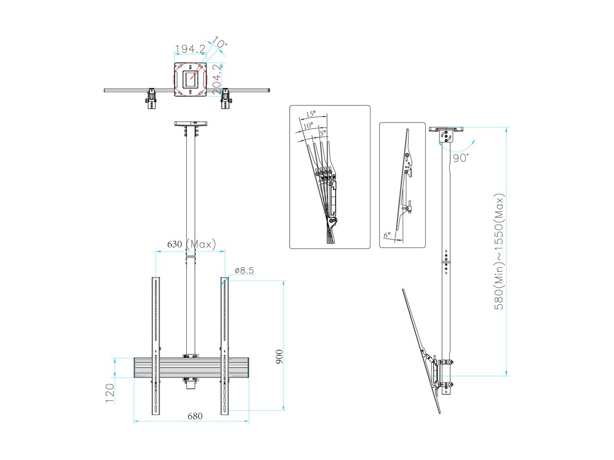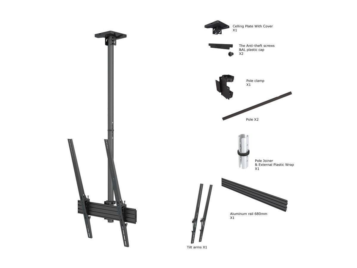 | Pillar length: | Min: 580mm to Max: 1550 mm from ceiling to VESA plate center Extension pipes: 1.5m (800mm*2pcs) included |