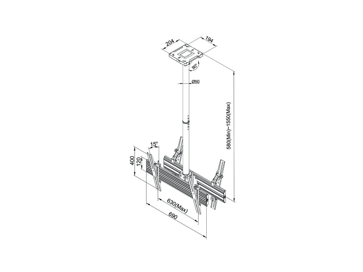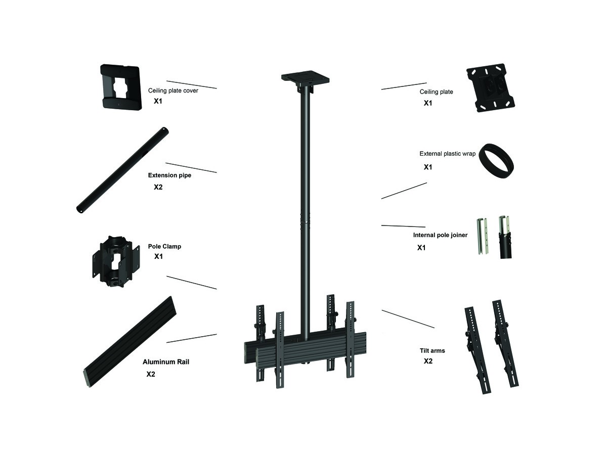 | Pillar length: | Min: 580mm to Max: 1550 mm from ceiling to VESA plate center Extension pipes: 1.5m (800mm*2pcs) included |