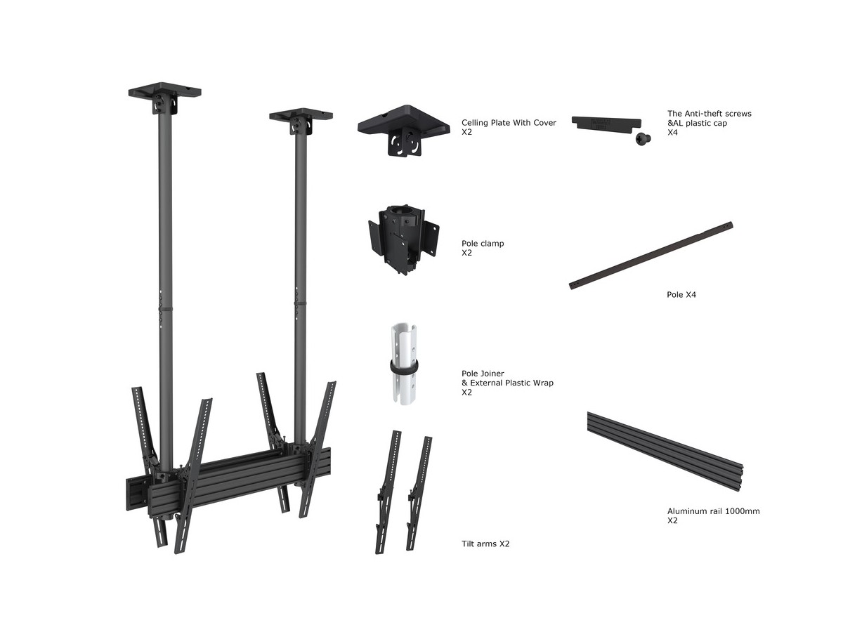 | Pillar length: | Min: 580mm to Max: 1550 mm from ceiling to VESA plate center Extension pipes: 1.5m (800mm*4pcs) included |