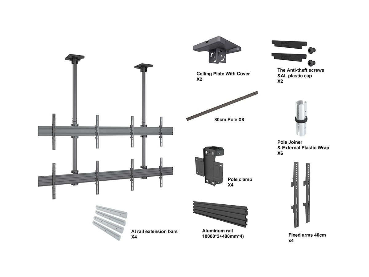 | Pillar length: | Min: 580mm to Max: 1550 mm from ceiling to VESA plate center Extension pipes: 3m (800mm*8pcs) included |