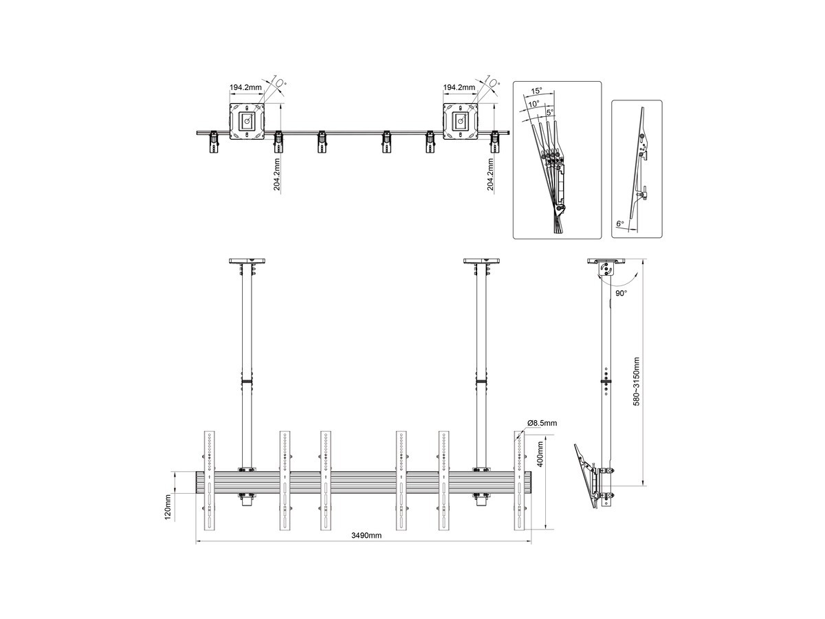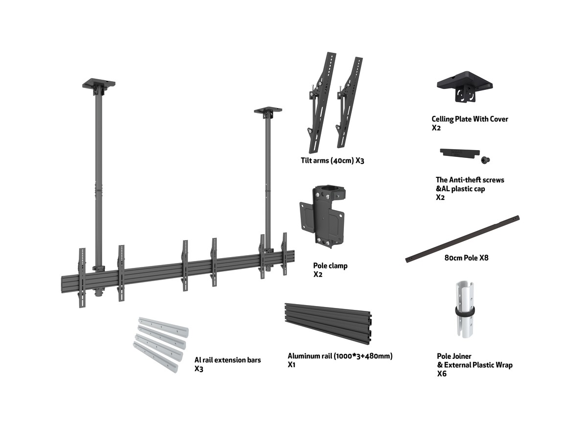 | Pillar length: | Min: 580mm to Max: 3150 mm from ceiling to VESA plate center Extension pipes: 3m (800mm*8pcs) included |