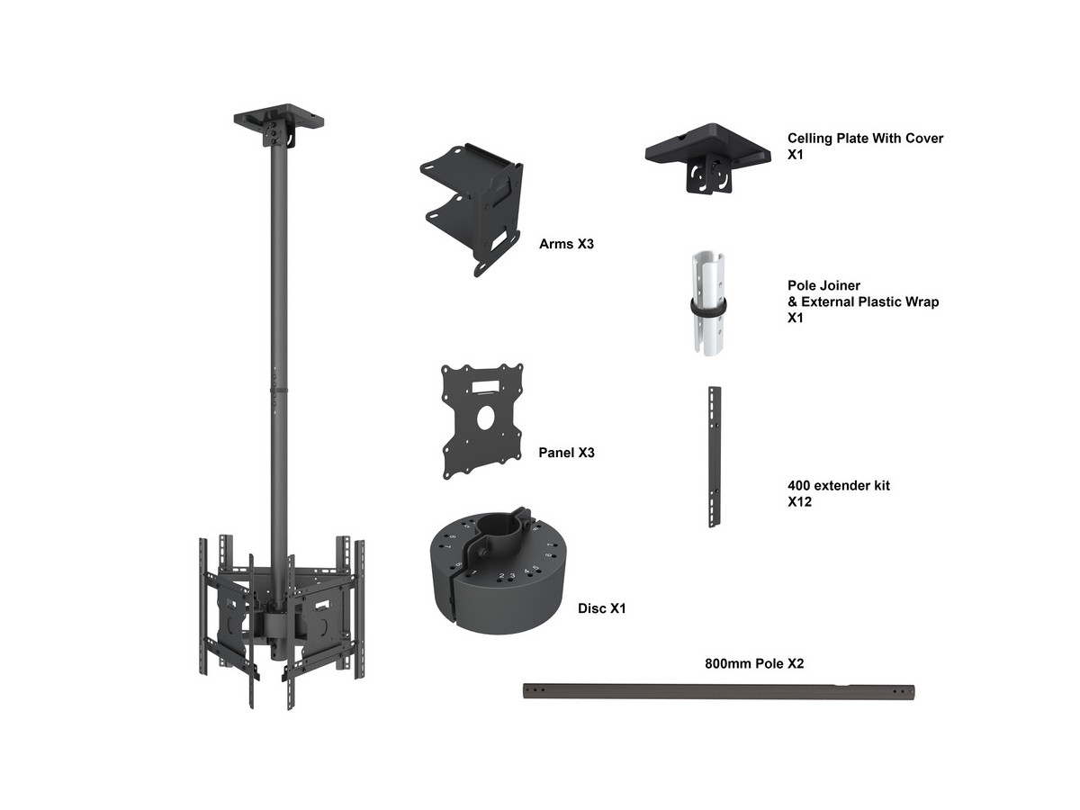 Product code:M Ceiling Mount Pro Triple 49BDL-4050D - Ceiling mount for LCD display, steel, 1.5m length, 3 screens, triple side, VESA Max 400x400 - screen size: 32"-49" - black