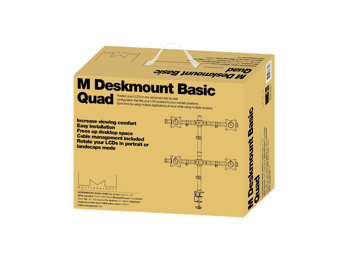 The M Desktopmount Basic Quad is your new office partner giving great flexibility and ease of adjustment and works with almost all LCD screens on the market supporting VESA standards of 75/ 100mm holding screen weight up to 8 kg.