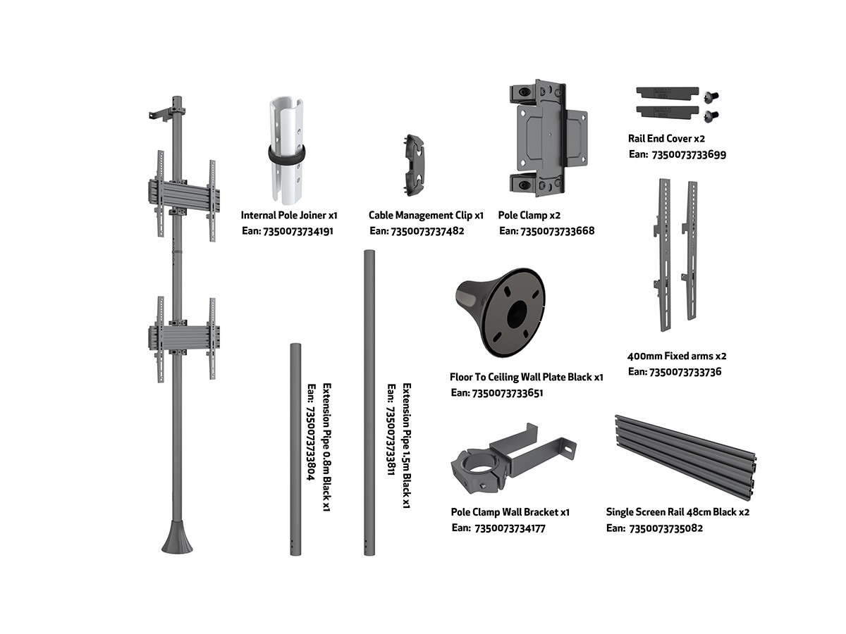 The M Floor to Ceiling Mount Pro MBFW2U creates a rock steady screen display solution aimed for the retail store, mall or any other public area. 50mm black, brass or chrome tubes can be tailored to fit the environment the unit is positioned in. Mount screens with tilt or fixed displays. Place them side by side and/or above each other.