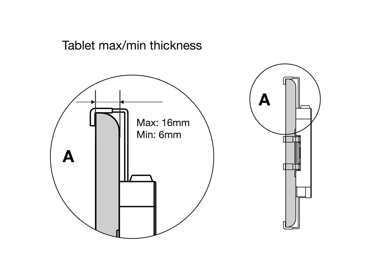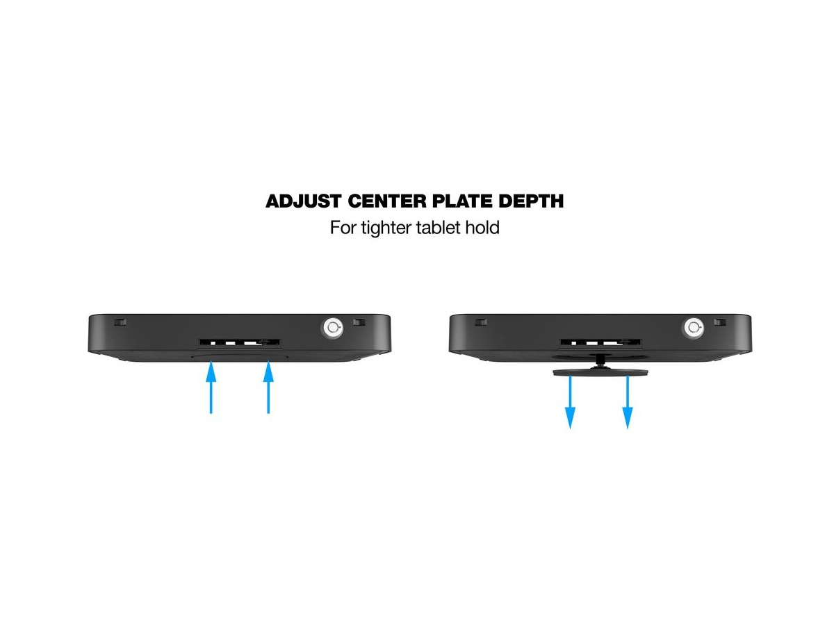 - Sliding arms accept most tablet sizes 7” to 13”, from iPad mini to iPad Pro, with or without case