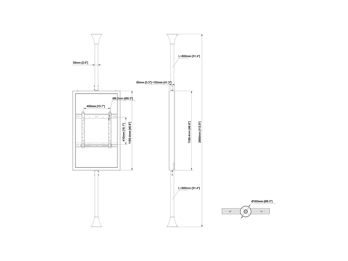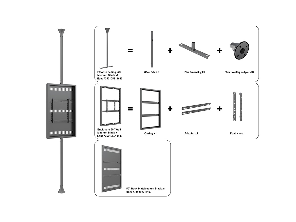 Product code:M Pro Series Enclosure 50" Floor to Ceiling Medium – Floor to ceiling mount with casing for display, steel, 3m length, 1 screen, single side, fixed arms, VESA max 600x400 - screen size: 50" - black