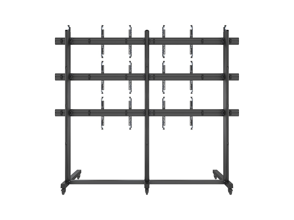 This 3x3 screen configuration freestanding video wall cart makes it possible to construct video wall in prominent locations for temporary applications.