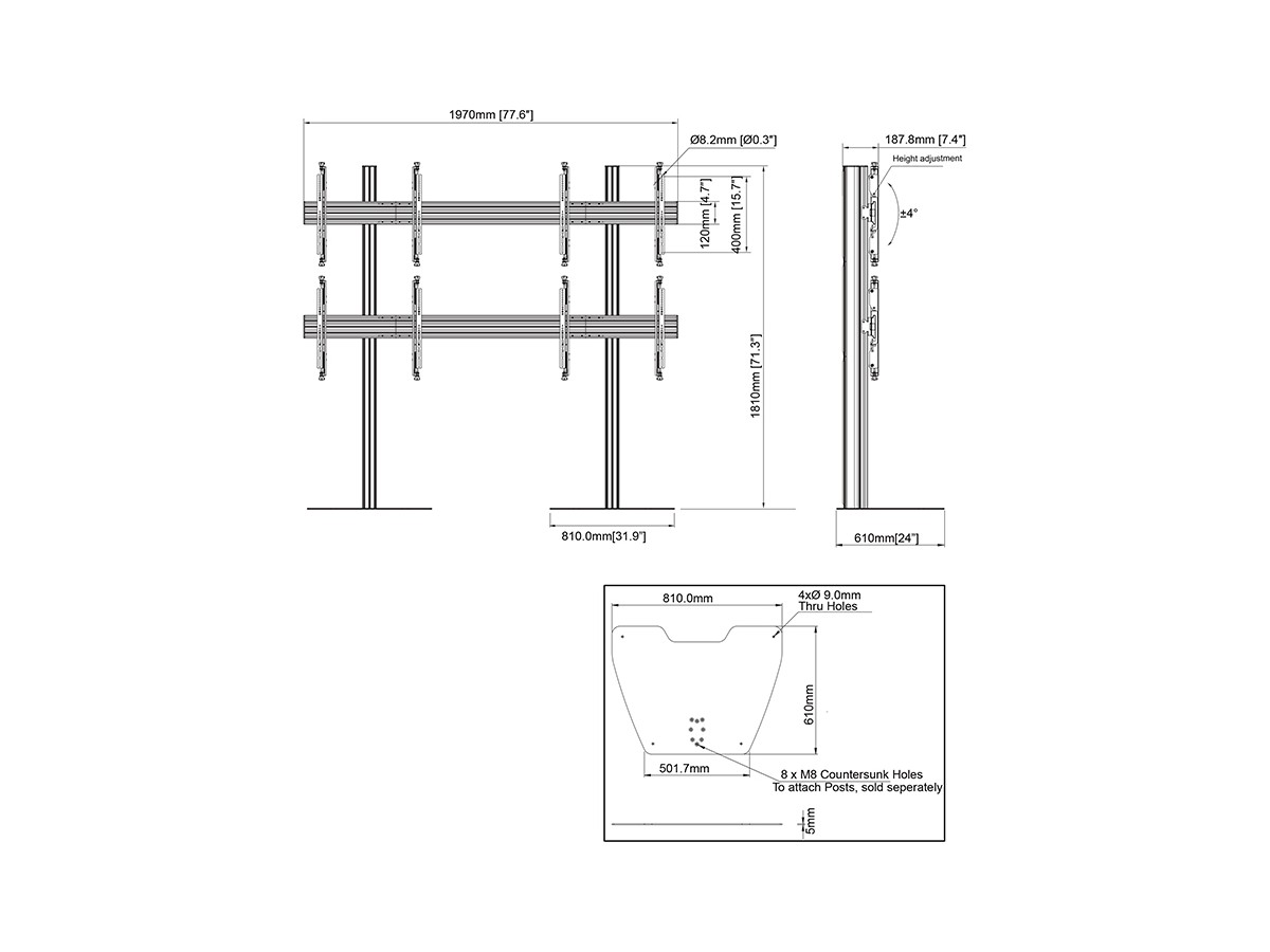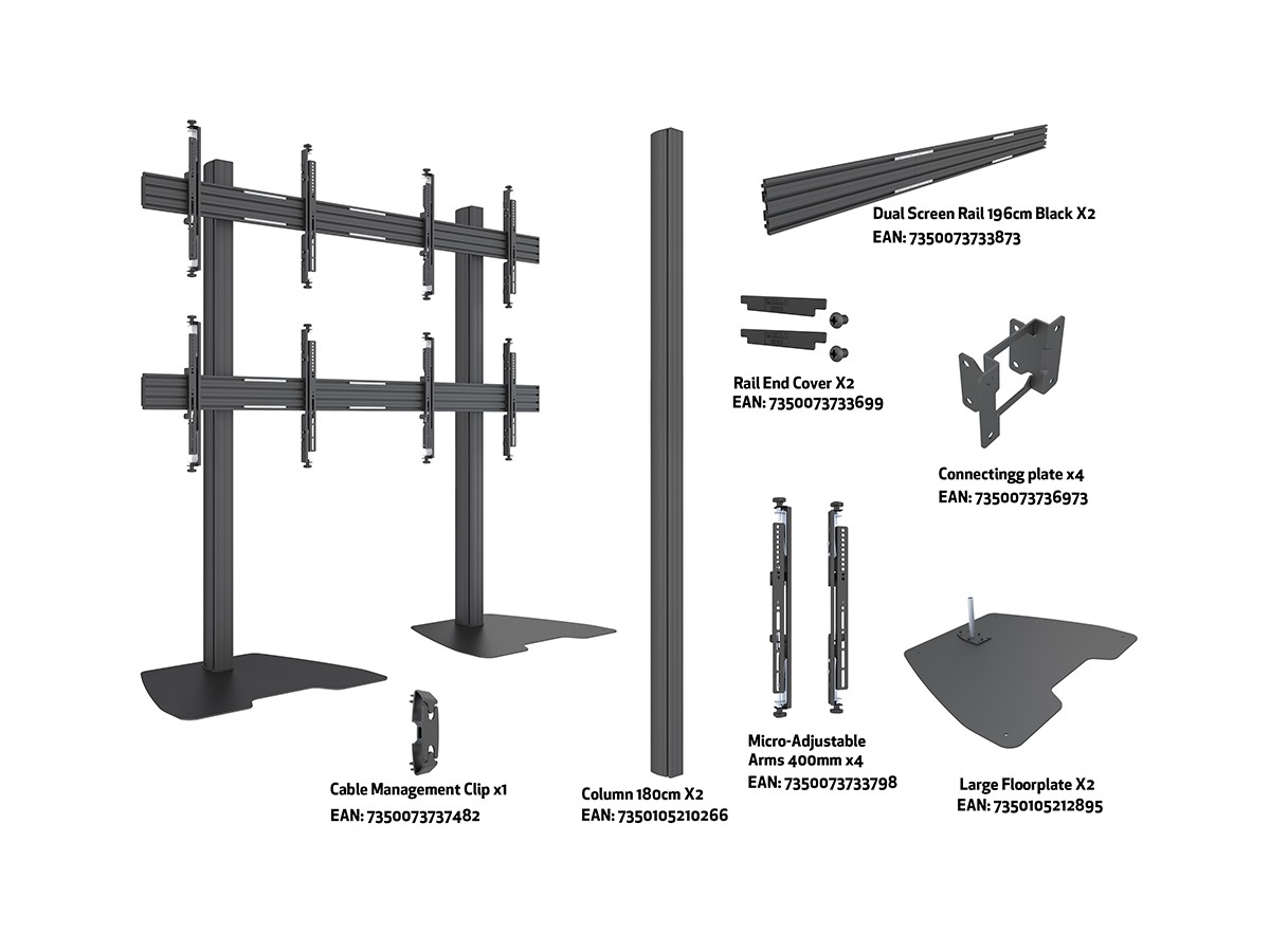 M Pro Series Video Wall Stand MBF2x2U 180 Micro Adjustable, 4 screen freestanding video wall stand makes it possible to construct video wall in prominent locations for temporary applications.