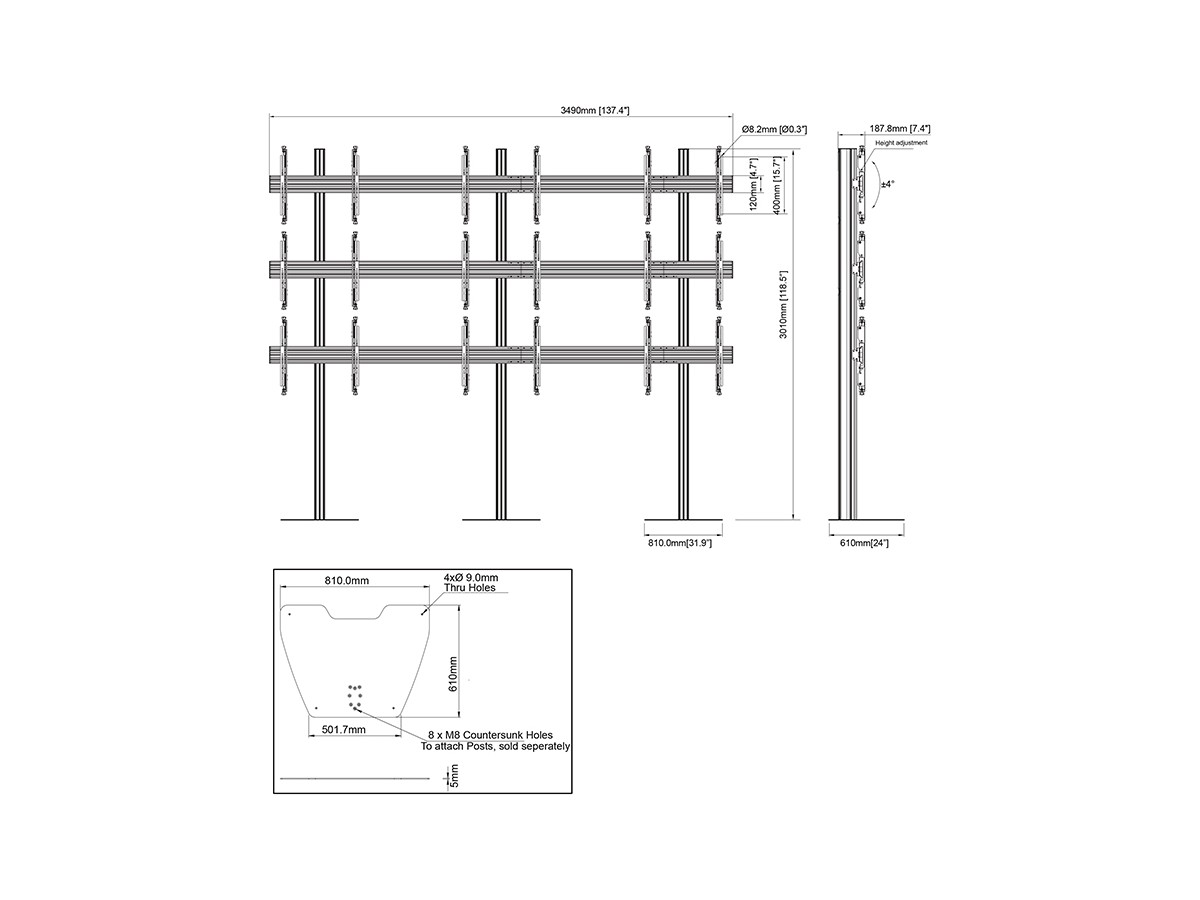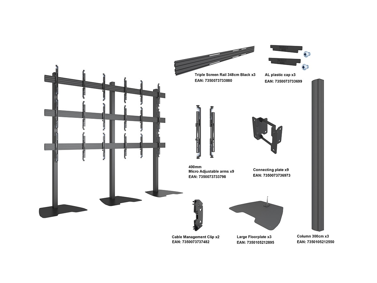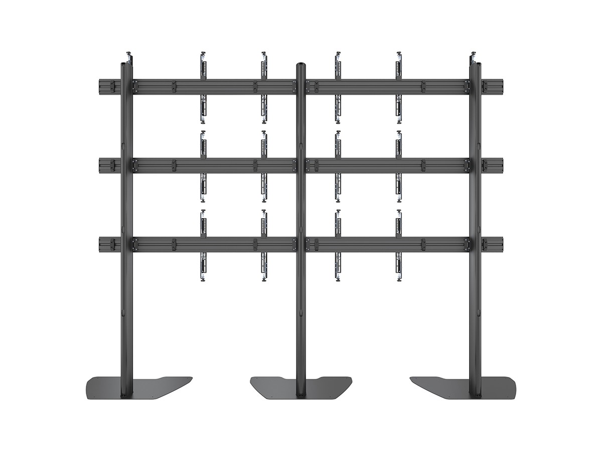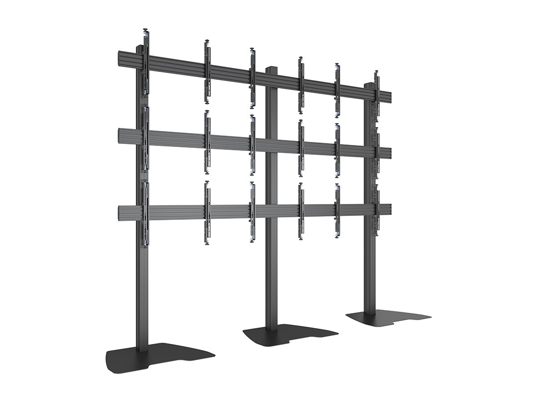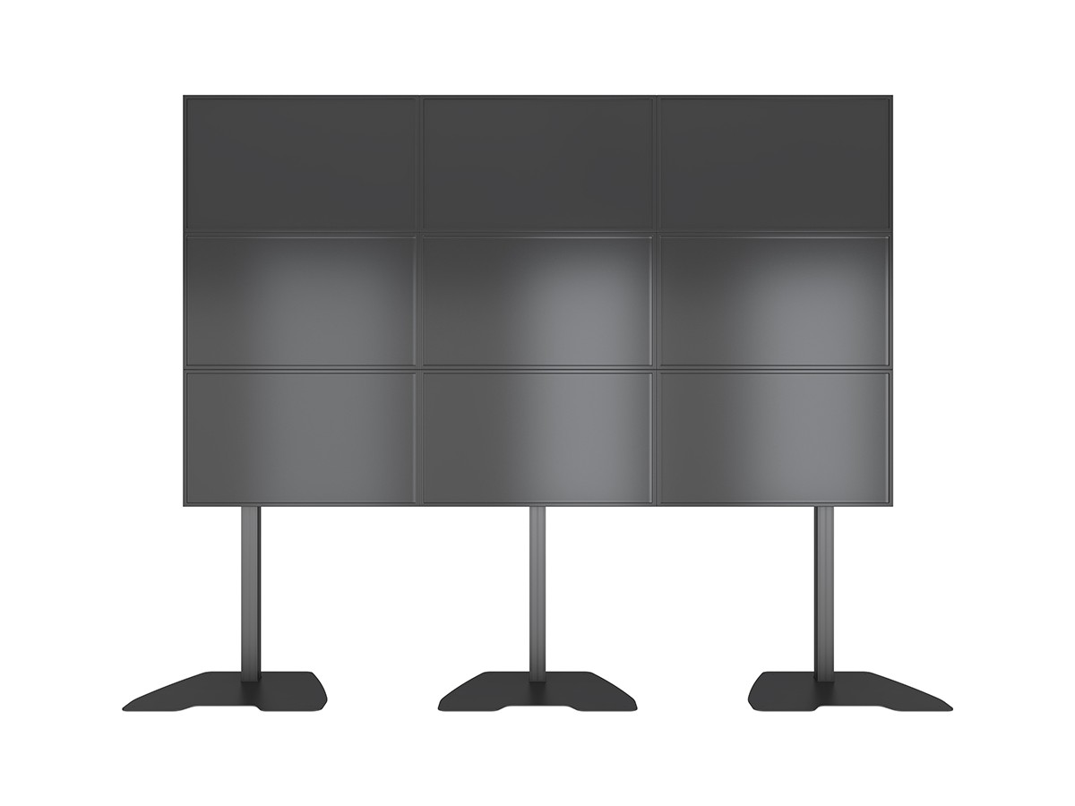 M Pro Series Video Wall Stand MBF3x3U 300 Micro Adjustable, 9 screen freestanding video wall stand makes it possible to construct video wall in prominent locations for temporary applications.