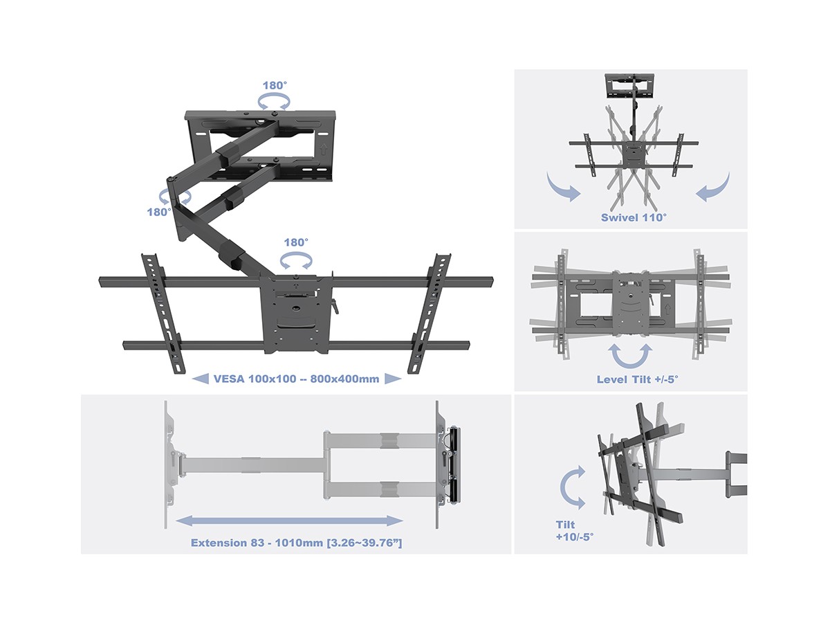 - Universal design supports VESA 100x100,200x100,100x200,200x200,300x200,300x300,400x200,400x400,600x400,800x400