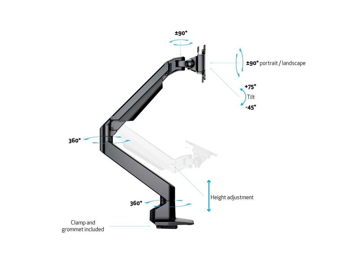 The M VESA Gas Lift Arm HD is made out of a durable aluminum construction and uses a gas driven suspension technique. This makes the screen "float" and it can then be moved with near zero effort. Sleek and streamlined, the M VESA Gas Lift Arm Single HD frees up space and allows positioning of your display for greater productivity. The unique counterbalance gas technology provides smooth adjustment in any direction. Easy move the screen from landscape to portrait position or move the screen close to the desk, high up, matching almost any wanted working position imaginable.