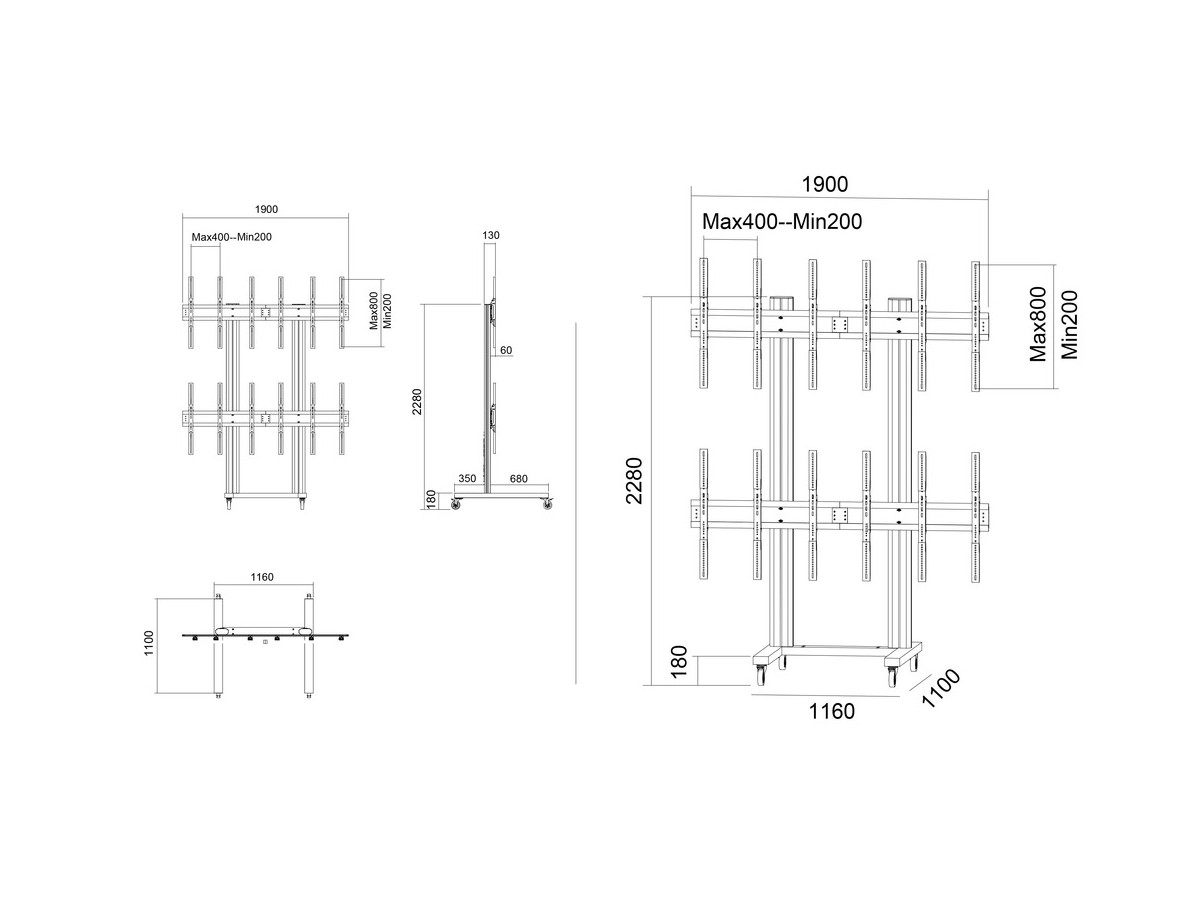Based on 210cm (Reaching 235cm with its wheelbase) high pillar made out of durable aluminum, the possibilities for height adjustments are very good and it is possible to provide perfect viewing angle for both a sitting and a standing audience. There is a power rail built into each pillar, providing 220v power to the screens or peripheral. This makes installation and cable management an ease. This movable video wall solution creates a solution that can be used for presentations, trade shows, store or office entrances.