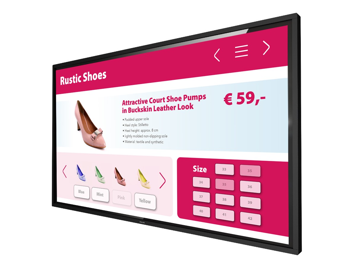 Product code:Inspire collaboration. Deliver information. This responsive Philips Multi-Touch Professional UHD Display is ideal for multi-finger, multi-user applications—from wayfinding to presentations. Up to 20 touch points can be active at once.